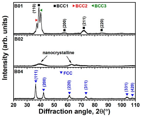 This study utilized co-sputtering equipment with four sputter guns, as described in []. Different direct current (DC) powers were applied to these sputter guns with targets 50.8 mm in diameter. The film substrates included Si wafers and SUS420 plates preheated to 400 °C. The Ta interlayer and laminated (NbTaMoW)Nx films were deposited at substrate holder rotation speeds (RH) of 10 and 2 rpm, represented as batches B and C, respectively. The Ta interlayer was deposited at a 200 W DC power and a 20 sccm Ar flow for 10 min. Subsequently, DC powers of 160, 200, 200, and 120 W were applied to Nb, Ta, Mo, and W targets, respectively. The nitrogen flow ratio (fN2 = [N2/(N2 + Ar)]) was adjusted to 0.1, 0.2, and 0.4 under a total flow rate of 30 sccm to deposit the (NbTaMoW)Nx films. The deposition time was 50 min. The batch B samples prepared at an RH of 10 rpm were designated as B01, B02, and B04 when fN2 levels were set at 0.1, 0.2, and 0.4, respectively, whereas the batch C samples prepared at an RH of 2 rpm were designated as C01, C02, and C04 when fN2 levels were set at 0.1, 0.2, and 0.4, respectively. Samples A01, A02, and A04 prepared at an RH of 30 rpm in our previous study [] were added to this article for comparison (Table 1).