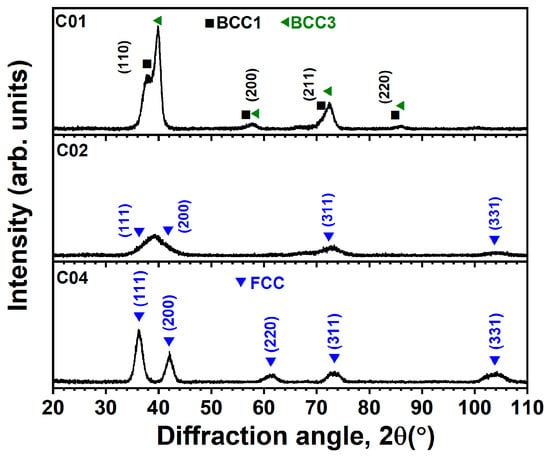 Figure 1 and Figure 2 display the XRD patterns of the (NbTaMoW)Nx films prepared with an RH of 10 and 2 rpm, respectively. The structures exhibit evident variation when altering the fN2 value from 0.1 to 0.2 and 0.4. The B01 and C01 samples exhibit multiple BCC phases, the B02 and C02 films reveal nanocrystalline structures with broad reflections, and the B04 and C04 films have a face-centered cubic (FCC) phase. The nanocrystalline C02 seems to have an FCC phase. In our previous study [], the (NbTaMoW)Nx films fabricated using an RH of 30 rpm exhibited chemical compositions of (Nb0.16Ta0.29Mo0.32W0.23)N0.07 (A01), (Nb0.14Ta0.29Mo0.31W0.26)N0.19 (A02), and (Nb0.11Ta0.25Mo0.33W0.31)N0.49 (A04) when prepared at an fN2 of 0.1 to 0.2 and 0.4, respectively. The phases were dominated by multiple BCC, M2N-type FCC, and MN-type FCC for A01, A02, and A04 samples, respectively. The NbTaMoW alloys consist of group VB and VIB elements and form a BCC solid solution because the alloys’ valence electron concentrations are in the range of 4.18–6.87 [,]. N atoms occupy the interstitials in metallic alloy structures. The N-containing HEAN films could form an amorphous or nanocrystalline structure when the N content surpasses the solubility in a BCC structure but is not enough to create an FCC phase, such as in (CrHfMoTaW)Nx [] and (HfNbTiVZr)Nx [] films.