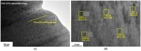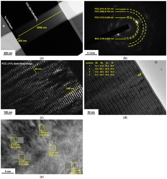 Figure 3a exhibits a cross-sectional TEM (XTEM) observation of the C02 sample. The C02 film and Ta interlayer thicknesses were 2950 and 202 nm, respectively. Figure 3b exhibits the selected area electron diffraction (SAED) pattern of the C02 film, which displays d-spacing values of 0.233 nm relating to a BCC (110) plane and 0.248, 0.154, and 0.131 nm relating to FCC (111), (220), and (311) planes, respectively. Figure 3c depicts a dark-field image corresponding to the diffraction signal of FCC (111) planes, revealing an evident laminated structure caused by a cyclical gradient concentration with a stacking period of 25 nm. Because the deposition time was 50 min, the RH for batch C samples was calibrated at 2.36 rpm. Figure 3d depicts the EDS analysis of the C02 films. Points 2 and 4 exhibit Ta- and Mo-enriched compositions, whereas point 3 exhibits a W-enriched composition. Figure 3e depicts a high-resolution TEM (HRTEM) image of the C02 film. The lattice fringes indicate that the C02 film is crystalline and comprises BCC and FCC mixed phases. Figure 4a displays an XTEM image of the B02 sample with a 218 nm thick Ta interlayer and a 2993 nm thick B02 film. Figure 4b shows the SAED pattern of the B02 sample, which exhibits d-spacing values of 0.235 nm relating to the BCC (110) plane and 0.250 and 0.132 nm relating to the FCC (111) and (311) planes, respectively. Figure 4c shows a dark-field image, which reveals an evident laminated structure caused by cyclical gradient concentration, and the stacking period of approximately 5.0 nm is narrower than that of the C02 sample. Figure 4d shows an HRTEM image of the B02 film, which indicates crystallinity.