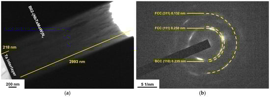 High-entropy alloys (HEAs) [], also mentioned as multi-principal-element alloys [], have attracted researchers’ attention for enhancing the characteristics of alloy materials. Refractory high-entropy alloys consisting of group IVB–VIB elements have been extensively explored to achieve innovative developments to respond to increasingly demanding and versatile industrial environments. The high-entropy effect causes these multi-principal-element alloys to form solid solutions with randomly distributed elements, and their films exhibit excellent mechanical, anticorrosive, and antioxidative properties []. The rapid quenching in the thin film process avoids phase transformation, favoring solid solution formation []. Solid solution and grain-boundary-strengthening mechanisms have improved HEA films’ mechanical properties, correlating with those of their bulk formats [,]. NbMoTaW [,], TaNbHfZr [], and TiZrHfTa [] alloys, typical refractory multi-principal-element alloys forming a body-centered cubic (BCC) phase, have hardness values of 3–5 GPa; however, their films exhibit distinct elevations in hardness. NbMoTaW films have high hardness values of 12–16 GPa [,,]. The hardness of TaNbHfZr films correlates with their structure, e.g., amorphous TaNbHfZr films prepared at room temperature and 500 °C exhibit hardness values of 8 and 13 GPa [,], respectively. In contrast, crystalline TaNbHfZr fabricated at 700 °C has a high hardness of 15 GPa [], while the hardness of TiZrHfTa films is relatively low, at 5–6 GPa []. Developing high-entropy alloy nitride (HEAN) films by incorporating nitrogen into HEA films offers a practical pathway to enhance mechanical properties. The (NbMoTaW)Nx and (TiZrHfTa)Nx films have hardness values of 25–32 [] and 14–26 GPa [], respectively. HEAN films are expected to serve as hard coating layers, corrosion-resistant layers [,], and diffusion barrier layers with improved mechanical performance [,,].