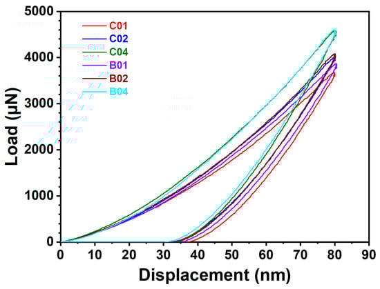 The adhesion between the laminated (NbTaMoW)Nx films and SUS420 substrates was assessed using the scratch test, with the scratch load incrementally increasing from 0.5 to 50 N. Figure 5 displays the surface morphologies of the scratched (NbTaMoW)Nx films. As the N content increases, the surface morphology transforms from buckling and wedging-type failures to continuous conformal cracking with slight recovery-type failures. The scratch tracks indicate three critical loads for film delamination, namely, LC1, LC2, and LC3 [], signifying the initial crack and delamination for films and the exposure of the substrate. Chipping and conformal cracks were initially observed at a critical load LC1 of approximately 5–10 N. LC2 corresponds to localized adhesive failure, with a load of roughly 6–12 N. The LC3 values vary significantly, decreasing from 40–41 N for the C01 and B01 samples to 19 N for the C04 and B02 samples. The high adhesion strength of the samples prepared at an fN2 of 0.1 is attributed to the fact that these films predominantly consist of metallic phases, which provide higher ductility. Figure 6 depicts the load–unloading plots of the indentation tests for the laminated (NbTaMoW)Nx films. The indentation depth is set at 80 nm. These curves seem smooth without discontinuous variations contributed by phase transformation during the tests []. Table 2 shows the mechanical properties of the columnar and laminated (NbTaMoW)Nx films. The films with high N contents, prepared with higher fN2 values, had higher mechanical properties. The hardness and elastic modulus increased from 21.6 and 325 GPa for the B01 film to 23.0 and 337 GPa for the B02 film, and 26.1 and 377 GPa for the B04 film, respectively. A similar variation tendency was observed for the batch C samples. The hardness and elastic modulus increased from 19.3 and 317 GPa for the C01 film to 23.4 and 337 GPa for the C02 film and 25.2 and 386 GPa for the C04 film, respectively. However, the films fabricated at a lower RH exhibited lower hardness values. The hardness decreased from 29.9 GPa for the A04 sample fabricated at 30 rpm to 26.1 GPa for the B04 sample (RH of 10 rpm), and further reduced to 25.2 GPa for the C04 sample (RH of 2 rpm). The hardness of 29.9 GPa is equivalent to the reported value of 30–30.8 GPa for (MoNbTaVW)Nx [] and (NbTaMoW)Nx [] films. The increase in RH decreased the equilibrated laminated period of the Ru–Zr multilayer films [], which improved the mechanical properties. The laminated films’ hardness and elastic modulus increased with the increase in the inlet fN2 during the sputtering process, and the films’ residual stress exhibited a similar trend. In contrast, the elastic modulus increased from 343 GPa for the A04 sample to 377 GPa for the B04 sample and 386 GPa for the C04 sample. This increase in elastic modulus with increased equilibrated laminated period should be ascribed to the strong bonding strength of the nitride. Previous studies [,,] pointed out that the hardnesses of HEAN films increases with the rising N content in the films or the use of a nitrogen flow. The common characteristic of these HEAN films with the highest hardness was the forming of an FCC phase. When nitrogen is introduced into NbTaMoW films, the mechanical properties are improved due to the nitride phase formation and the transition of the bonding structure from metallic to covalent. The residual stress increased from −0.04 to −0.18 and −1.91 GPa, accompanied by an increase in hardness from 21.6 to 23.0 and 26.1 GPa for the B01, B02, and B03 samples, respectively. A similar trend was observed for the hardness values of C01, C02, and C03 samples. This result implies the influence of laminated structure formation.