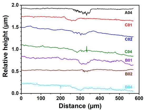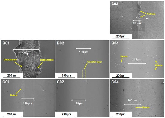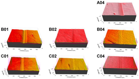 (3) Except for the B01 film, all laminated (NbTaMoW)Nx films had wear depths less than their thicknesses, indicating that they were not worn through. The C04 film showed the lowest wear rate (3.16 × 10−7 mm3/Nm), which was significantly superior to the B04 and A04 films. In contrast to monolithic coatings, multilayer coatings exhibit lower hardness and increased toughness and wear resistance.