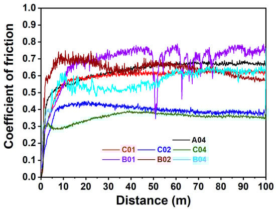 Wear tests were conducted on the (NbTaMoW)Nx films deposited on SUS 420 stainless steel. Figure 7 presents the scanning electron microscope images of the (NbTaMoW)Nx films after undergoing wear tests. The columnar A04 film exhibited a narrower wear width of 96 µm relating to 59–215 µm for the laminated (NbTaMoW)Nx films. Potholes were observed on localized regions of the A04 film; however, these potholes were not worn through. Debris and transfer layers were the most significant forms of damage on the worn surface of the laminated (NbTaMoW)Nx films. A severe detachment was observed for the B01 film. Figure 8 displays a magnified image and EDS analyses of the partially detached B01 film. Parts of the B01 film exhibited Fe signals, indicating the SUS420 substrate’s exposure. In contrast, the rest of the regions of the B01 film revealed a smooth surface similar to the other laminated films. Except for the B01 film, all laminated (NbTaMoW)Nx films exhibited smooth surfaces in the interior portions of the wear tracks. Most of the debris was implanted into the surfaces. In contrast, the debris from the B04 film was distributed outside the wear track and on the free surface, which could be attributed to the higher hardness of the B04 film. Figure 9 displays the record of the COF in a wear distance of 0–100 m. Except for the B01 sample, all the other films displayed a stable COF after the running-in period. Evident fluctuations in the COF curve of the B01 sample were ascribed to the partially detached region formed after wearing for 50 m, revealing a high COF of 0.72. The transfer layer of the B02 sample formed on a narrow portion of the wear track after accumulating the wear debris. The average COFs in the sliding interval of 30–100 m are listed in Table 3. Both the batch B and C samples exhibited a decreased COF value when prepared at a higher fN2. For example, the COF values are 0.72, 0.63, and 0.59 for the B01, B02, and B04 samples, respectively. Moreover, the batch C films exhibited much lower COF values than the batch B films. Except for the B01 film, all of the (NbTaMoW)Nx films had wear depths less than their thicknesses, indicating that they were not worn through. The COF curves’ low and smooth variation could be attributed to the MoO3 and WO3 solid lubricants, reducing debris generation during the wear tests and leading to smooth wear surfaces [,]. The wear rate of the C04 film is 3.16 × 10−7 mm3/Nm, lower than the 8.27 × 10−7 and 1.02 × 10−6 mm3/Nm for the B04 and A04 films. In the films mentioned above, fabricated at an fN2 of 0.4, the A04 film had the highest hardness, H/E, and H3/E2 ratio, but had the lowest wear resistance. H/E and H3/E2 are the indicators that predict thin films’ toughness and wear resistance [,,], but they do not seem suitable for estimating the performance of laminated films. As reported in previous studies [,], the sublayer interfaces in coatings can reduce the COF and improve wear resistance. Multilayer coatings have the characteristics of altering the crack propagation path via the transition zones between adjacent layers []. Ref. [] reported that multilayer coatings exhibited lower hardness and elastic modulus, and higher toughness and adhesion, than monolithic coatings. Moreover, the high H/E ratio and low wear resistance of multilayer films could be attributed to the high intrinsic stress []. Figure 10 displays 3D images of the wear tracks examined using white light interferometry, showing smooth tracks. Figure 11 shows the 2D profiles of the cross-section of wear tracks. All (NbTaMoW)Nx films have wear depths less than the thickness, confirming that these films have not been worn through.