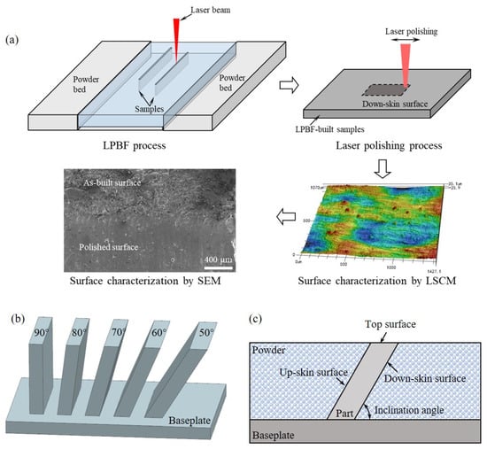 For the as-built surfaces of LPBF-built components, the side surfaces normally have higher surface roughness, which is inherent to the layer-wise process [18]. The side surfaces can be classified into two categories: the down-skin (the downward-facing) surface and the up-skin (the upward-facing) surface. It is found that the surface roughness of up-skin surfaces is 2–17 µm, while the roughness value of the down-skin surfaces is over 25 µm [19]. For the typical AM-manufactured components, the area of top surfaces is ignorable compared with the high proportion of the up-skin and down-skin areas of the manufactured components [20,21]. Current research focuses mainly on the top surfaces [22,23] or the side surfaces of the vertically fabricated specimen [24,25]. For instance, Narayanan et al. [19] performed the surface polishing of LPBF-built samples, where the up-skin surface with different inclination angles was considered. However, the situation of the surface morphology on the down-skin surfaces is quite different, which not only relies on the geometry of the step edge and the adhesion of the partially melted metal particles but is also highly related to the infiltration of the melt pool into the powder bed [26]. The topological characteristics of the down-skin surface are particularly representative of AM-built components compared with those of the up-skin surface and the top surface of LPBF-built specimens. It is, therefore, of great importance to conduct investigations on the laser polishing of the down-skin surfaces of the LPBF-built component.