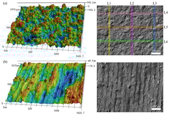 Three-dimensional and two-dimensional surface topographies of the LPBF-built specimen with an inclination angle of 50°: (a) the side surface and (b) the top surface.