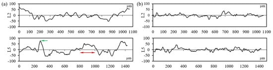 To further evaluate the surface topography of the LPBF-built sample, the profile distribution of the specimen with inclination angles of 50° and 90° is measured and displayed in Figure 4. L2 indicates the profile curve along the vertical direction, while L5 is the profile curve along the horizontal direction, as illustrated in Figure 2. The height of the irregularly shaped peaks achieves 76 µm for the specimen with an inclination angle of 50°, which is pointed out by the green arrow in Figure 4a. The span of those agglomerated peaks achieves 200 µm, as denoted by the red arrow in Figure 4a. Given the powder size distribution (8 µm~50 µm) in this work, considerably large-sized peaks (>50 µm) with irregular shapes are formed mainly due to the melt pool extension attributed to insufficient support from the powder bed, as well as the gathering of the partially melted particles. As shown in Figure 4b, the span of the agglomerated peaks, which corresponds to the powder size distribution, is much smaller, and the height of those peaks is less than 45 µm. Therefore, the formation mechanism of the irregularly shaped peaks on the specimen with an inclination angle of 90° is due to the gathering of partially melted powder particles.