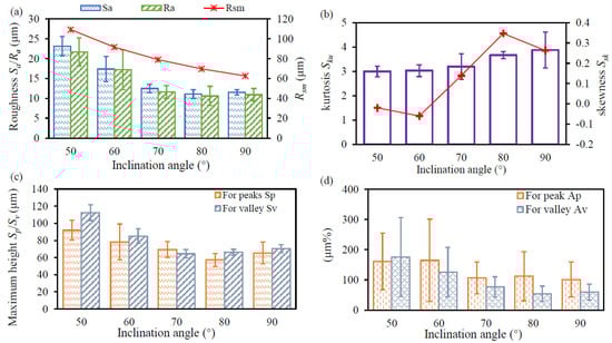 The surface characteristics are summarized in Figure 5. The profile roughness of one measured area is the average value of six profile curves, i.e., L1–L6, shown in Figure 3. As expected, the areal roughness Sa and profile roughness Ra of the down-skin surface decrease with the inclination angle, as shown in Figure 5a. Rsm is introduced to evaluate the staircase effect, and the Rsm model is presented in the reference [20]. The result indicates that the measured surface roughness is dominated by the effect of the staircase. As shown in Figure 5b, the areal kurtosis Sku equals 3 for the specimen with an inclination angle of 50°, indicating a normal distribution for the height. The Sku increases slowly to 3.9 when increasing the inclination to 90°, revealing that the height distribution on the measured surface is spiked. The down-skin surfaces on the specimen with an inclination angle of 50° are negatively skewed surfaces, whereas those on the specimens with an inclination angle over 70° are positively skewed. Figure 5c displays the variation in Sp and Sv as a function of the inclination angles. The magnitude of Sp and Sv is decreased when increasing the inclination angle from 50° to 80°, whereas a visible increase can be observed when the inclination angle varies from 80° to 90°. The cross-section of peaks and valleys on the 2D profile is also calculated to identify the predominance of peaks and valleys, as shown in Figure 5d. For the case with an inclination angle of 50°, the cross-sectional area of valleys is higher than that of peaks. However, the peaks occupy the domination of the cross-sectional area if the inclination angle is over 60°.
