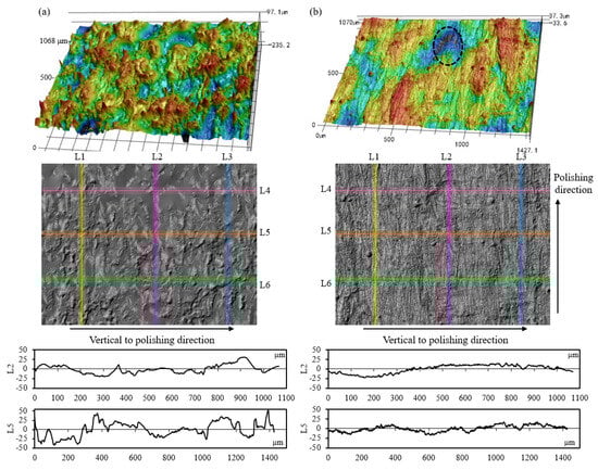Figure 7 presents the variation in the surface modifications polished with various laser powers. When using the parameters of 40 W and 300 mm/s (Figure 7a), a high level of irregularity is observed since the original morphological features of the LPBF-built surface are basically preserved. The 2D profile in Figure 7a also reveals that the magnitude of the irregularly shaped peaks with large dimensions is decreased to less than 50 µm. In the case of 120 W and 300 mm/s (P5), the laser polishing can remove the powders that are attached to the as-built specimen surface, as shown in Figure 7b. Highly smoothed profile curves are observed along the laser polishing direction (L2) and the direction vertical to laser polishing (L5). The tiny serrated features on the 2D profiles in Figure 7b represent the laser ripples formed when performing the laser polishing. It has been reported that the formation of those surface ripples mainly comes from the convection within the melt pool at the laser-irradiated zone [37]. It should be pointed out that the deep valleys formed during LPBF (indicated by the black dotted circle in Figure 7b) are still distinguished even if high-power laser polishing is performed.