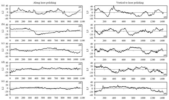 Profile morphology on the polished surface of specimens under various scanning speeds: (a) 500 mm/s, (b) 400 mm/s, (c) 300 mm/s, (d) 200 mm/s, and (e) 100 mm/s. L2 indicates the profile along the polishing direction, and L5 displays the profile vertically to the polishing direction.