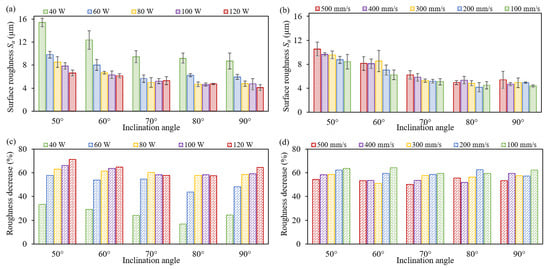 Surface roughness Sa and its decrease after laser polishing: (a–c) under different laser powers, and (b–d) under different scanning speeds.