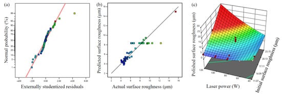 (a) Distribution of normal probability with residuals; (b) comparison of the actual and predicted values; (c) three-dimensional response surface model with the influence of the initial surface roughness and the laser power on the polished surface roughness.