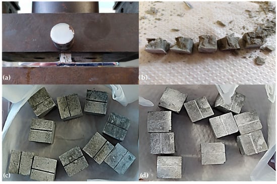 To examine the activation of bacteria over time, as well as the influence of different curing conditions on their activation and their activity over 14 days, the compressive strength of the paste samples after exposure to the self-healing process was determined. The samples were removed from their curing conditions and wiped clean of any loose material or standing water. Each sample was placed between the platens of the testing machine (Figure 1a). A Universal testing machine ZDM 5/91 (WPM, Leipzig, Germany) with a range of 25 kN was used for those purposes. The maximum load sustained by each sample before failure was recorded. The compressive strength for each sample set was determined as the average value of 10 test results. The results from the compressive strength tests were compiled and analyzed statistically to compare the performance of bacterial versus control samples under different environmental conditions. Figure 1b shows the samples after pressure setup, while Figure 1c,d present cracked control and self-healed bacterial samples prior to testing at the age of 28 days.