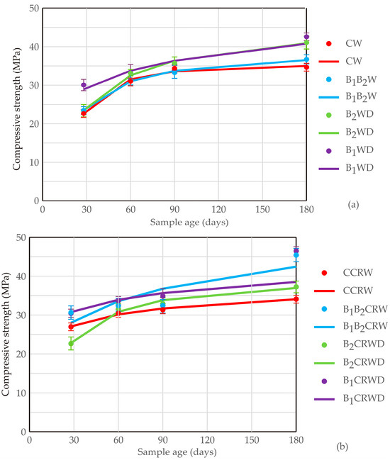 The diagrams in Figure 3 illustrate the development of compressive strength (expressed in MPa) over time for various sample runs, with data points corresponding to different sample ages ranging from 28 to 180 days. The results reveal a clear trend across all samples, where compressive strength generally increases as the material ages. This behavior is consistent with typical materials such as concrete, which gain strength over time because of the hydration process. Except for short-term healing, the compressive strength results demonstrate significant long-term improvements. Over 180 days, samples subjected to wet and wet–dry cycles showed consistent gains in compressive strength, highlighting the durability of the self-healing mechanism. Based on these results, it can be suggested that the autochthonous bacterial co-cultures contribute to immediate crack healing and continue to enhance material integrity well into the long term, making them viable for real-world applications where durability is a priority.
