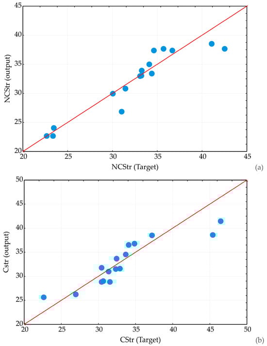 The provided scatter plots (Figure 4) illustrate the relationship between the target compressive strength and the predicted compressive strength across various samples, which include training, testing, and validation datasets. The plot includes a red line representing the ideal scenario where the predicted values perfectly match the target values (i.e., the line of equality where NCStr Target equals NCStr Output or CStr Target equals CStr Output).