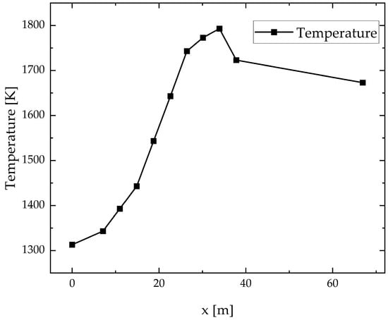 Stemming from a 1300 tons per day actual FFDC in service at a glass production company in Hubei Province, China, a model of the molten glass, as shown in Figure 2, has been developed by selecting molten glass for the object of study. The interface between the pile and the molten glass is chosen for the velocity inlet, with a velocity of 1.59 × 10−5 m/s based on the daily production rate. The equivalent hydraulic diameter of the channel is 18.49 m. The heat transfer coefficient is 5 W/m2∙K on the upper surface, and on the other three surfaces is 3.5 W/m2∙K by measuring the real melting furnace. Because the heat comes from the flame space above the molten glass, the boundary condition of temperature is measured by the surface of the actual melter and compiled by UDF (user-defined functions), which is shown in Figure 3. Molten glass flows through the waist and double cooler and finally out of the outlet, which is defined in the outflow. The major size of the furnace model is shown in Table 1. The physical parameters of molten glass via experiments and comparisons with other works [27,28] are shown in Table 2.