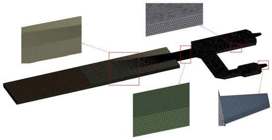 The behavior of molten glass in the melting furnace follows the laws of conservation of mass, momentum, and energy. The mathematical expressions corresponding to these principles in hydrodynamics are the continuity equation, the momentum conservation equation, and the energy conservation equation, respectively. According to the Reynolds number, the flow inside the glass melting furnace should belong to laminar flow, which has also been supported in similar studies [14,15,16]. The global grid size is 0.2 m due to the size of the outlets and waist, and the grids in these locations have been refined by 0.1 m. The total grid number is 1,019,051, and the grid type is hexahedronal. The grids and local details, which are indicated by arrows and squares, are shown in Figure 4.
