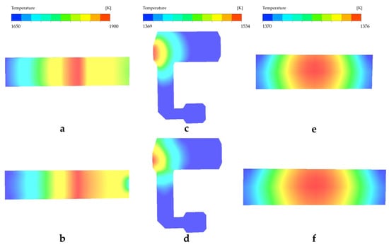 The temperature distribution is shown in Figure 5, where (a) and (b) show a high trend in the middle and low parts at both sides in the temperature of the melter, which is caused by the arrangement of the furnace, i.e., higher heat load in the middle and lower parts in both ends. Currently, there is no better temperature distribution pointed out by any studies from the literature, but in production, the location of maximum temperature, which is called a hot spot, is always located in 1/2 to 2/3 of the whole melting section in the direction of flow. The maximum temperature occurs at about 32.5 m far from the face wall, which is at 54.7% of the melting section and fits the requirement. At the bottom of molten glass, a lower and smoother temperature distribution is represented than the surface; this is caused by the flame space heating the surface, and the heat transfers to the bottom mainly through the heat conduction of molten glass. At the end of the melter, there are a few differences between the surface and bottom because of the waist. Figure 5c,d indicate that the temperature distribution of the cooler is affected by heat dissipation and heat from the waist; the highest temperature occurs at the inlet of the cooler. Unlike the single cooler, because of the existence of a branch line, the temperature reveals radial distribution in the shape of a half-circle; the max temperature reaches 1530 K (1257 °C), which is at the waist. The temperature differences in the surface and bottom at the main line and branch line are 60 K and 43 K, respectively, which indicates better stability after one. Combined with Figure 5e,f, the temperature differences between the inlet and outlet of the main and branch lines are 162 K and 189 K on average. At the same time, a radial temperature distribution appears in the outlet of two lines, with a 3 K difference between the max and min temperature of each line outlet and a 4 K average between the two lines. The reason for the larger temperature difference in the branch line is that the flow path of the branch is longer than the main line, which gives enough time to cool the molten glass through natural heat dissipation. The other potential reason is presumed to be that a greater diversion of the branch lines causes a higher convective heat transfer coefficient [30].