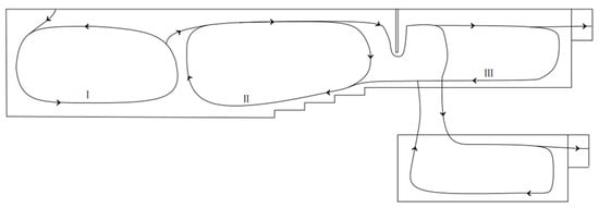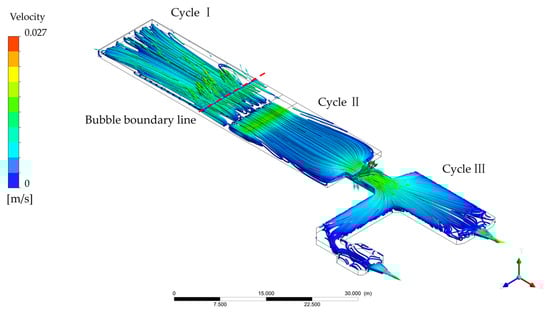 Three flow cycles are referred to in some research on float glass melting furnaces with single lines, and they have proven to play a crucial role in glass production [14,30]. In the new structure, the three flow cycles similar to a single line are discovered and shown in Figure 6. The formation of cycles is mainly influenced by three factors: difference in molten glass density caused by different temperatures, compensation of molten glass flowed out, and block out by furnace wall. We continued to use the names Cycles I, II, and III. Cycle I is located in the head of the melter; here, the pile absorbs heat because the reaction causes the molten glass to cool down; thus, density increases, and molten glass sinks and flows ahead along the bottom. Because of the step of the bottom, molten glass belonging to Cycle I is forced to flow up. At the same time, the upper molten glass is blocked by the waist and refluxing. Finally, Cycle II takes its shape. Paradoxically, however, lower molten glass must flow out from the melter to the cooler via the space, which is located at the bottom of the channel. To find a new harmony, part of the molten glass separates from the reflux and flows into the cooler. When molten glass flows in the cooler, it spreads surroundings and is blocked by a wall of the cooler, which establishes Cycle III. Cycle III appears in both the main and branch lines simultaneously, which is different. The flow is more chaotic because of more twists in the branch line. The three flow cycles in FFDC are shown in Figure 8.