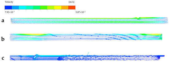 The flow field is shown in Figure 6 and Figure 7. Figure 6 indicates the streamline of the whole FFDC. It can be seen that the reduction gives rise to the velocity gradually increasing at the head of the melter; the trend stops at about 27 m away from the inlet face wall. This is called bubble boundary in production as it has bubbles on the molten glass from the pile. The maximum velocity reaches 0.027 m/s located here. The velocity of glass is one of the most important parameters in the float glass process because it is closely linked with the quality of the glass forming; it could cause irregularity, turbidity, and a block by being too fast or too slow. Considering the clarification, for example, the above simulation result indicated that the average residence time of the glass after the bubble line to the waist is about 3000 s. From Stokes’ law [7], as given in Equation (4), the average temperature of the liquid glass is about 1595 K. From the aforementioned density–temperature linear relationship ρ(T) and kinetic viscosity–temperature linear relationship μ(T), with the assumption that the diameter of the air bubbles D = 0.001 m, the uplift velocity is about 6 × 10−4 mm/s. So, the time required for bubbles to rise from the bottom to the top is about 2700 s. Therefore, it can be further assumed that the majority of air bubbles can reach the liquid surface and exit before the liquid glass reaches the waist.