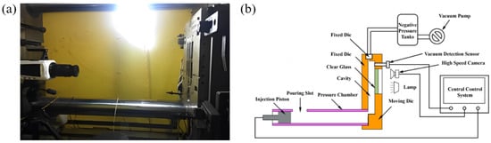 In summary, there is an urgent need for a feasible method to directly characterize and study the flow behavior of molten metal within molds. To address this, this paper innovatively adopts a novel dynamic visualization method for die filling characterization, utilizing a specially designed die with a glass window. This setup allows for direct observation and investigation of the filling flow behavior of high-pressure die-cast aluminum alloys within the mold, thereby facilitating the analysis of the mechanisms underlying casting defects and the impact of varying injection rates on the fluidization and evolution of gas-induced alloy defects.