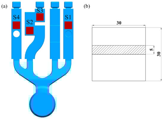 Three-dimensional model of the sample and sampling location (S1, S2, S3, S4). (a) Sampling location diagram; (b) specimen size.