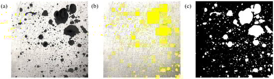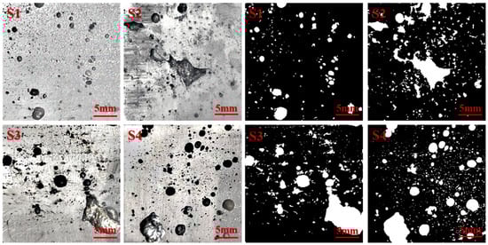 The cross-sectional hole testing software Image-Pro Plus was used to measure the hole defects on the sample’s surface and the effect is shown in Figure 4. The boundary of the defect was captured via a change of light to identify the location of the defect and mark it. At the same time, the required element points were marked, and the redundant element points were ignored according to the needs of the analysis. The qualified holes were then screened out through the measurement function to calculate the number and size of the marked holes.