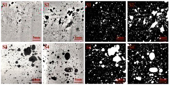Figure 8 and Table 2, respectively, show the distribution of the morphology and defect data of the holes at the S1, S2, S3, and S4 positions when the thickness of the inner gate is 3.0 mm and the injection velocity is 1.5 m/s. It was revealed that when compared with those in Figure 7, the S1 location hole size and morphology of the gap are not very large. In the filling flow process, as shown in Figure 5, when the liquid metal filling is fast in cavity 1, front metal atomization occurs, impacting the cavity wall in all directions after reflow. The reflow combination of metal and flow was not intact, and in the middle, a small amount of gas formed after solidification scattering the distribution of the small holes.