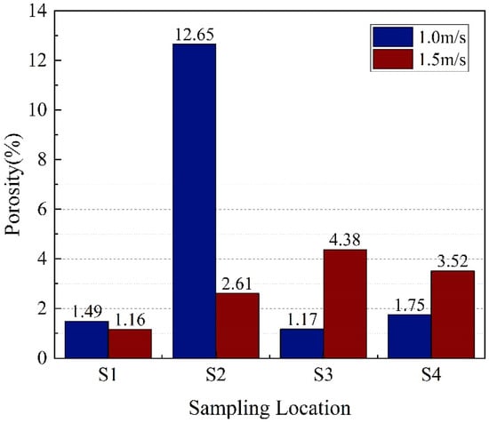 The morphology of S3 is similar to that of S2. However, since S3 is at the back end of filling S2, the influence of the injection velocity on the liquid metal flow at S3 will be significantly weakened when the liquid metal flows into S3. It was observed through the video that at the S3 position, the flow morphology differences between the injection velocity of 1.0 m/s and 1.5 m/s are not apparent, so the porosity difference at the position of S3 is not significant. The porosity at the S4 position is larger when the injection velocity is 1.5 m/s.