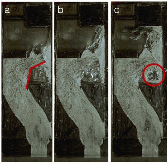 Moreover, there are inherent challenges in comparing water simulation experiments with numerical simulations. Niida et al. [] utilized water simulation equipment to directly observe mold filling behavior and conducted mold filling simulations using TopCAST (https://www.toyotasystems.com/product/cae/detail/topcast.html, accessed on 10 October 2024). Their analysis indicated that the filling behavior of water and the volume of entrapped air were nearly consistent with experimental results. Although the computational results aligned closely with the experimental trends, some discrepancies were still evident. Consequently, there is a necessity to validate the computational conditions and introduce new air movement algorithms to make the simulations more representative of real phenomena. Liu et al. [] conducted both water and numerical simulations of flow behavior in a steel ladle, noting that the density difference between the tracer and water in the experiments could lead to significant errors.