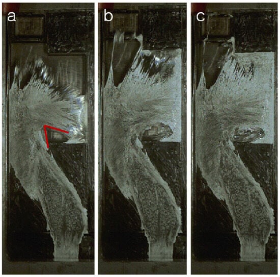 As shown in Figure 10, when the liquid metal reaches the baffle of the arch cavity, the flow direction of the liquid metal changes. In the red corner of Figure 10a, the change angle is approximately 140°. At this point, the incoming flow, the backflow, and the air in the cavity interact to form a loose vortex flow, as shown in Figure 10b. It can be seen from the figure that some liquid metal with small dispersions has solidified due to a decrease in temperature (the white reflective part in the figure), which adversely affects the liquid metal filling flow’s ability. Due to the reduced flow capacity of the liquid metal and the shear caused by the backflow, incoming flow, and air, the liquid metal will generate vortices, forming a huge hollow cavity at position S2. Its position and size are marked by a red circle, as shown in Figure 10c. Therefore, when the injection velocity is 1.0 m/s, the porosity of the sample is more significant. However, when the injection velocity is 1.5 m/s, the flow state will be significantly different from that of 1.0 m/s injection velocity. As shown in Figure 11, when the liquid metal impacts on the bow baffle at a high speed, the transformation direction of the liquid metal is shown in Figure 11a, with an angle change of more than 90°. The angle formed via the liquid metal at the front and the back end is only about 45°. Compared with the speed of 1.0 m/s, the liquid metal flow’s ability is much stronger. The liquid metal at the front end hits the wall of the right cavity quickly and then turns around and rushes back, forming an elliptical cavity with the liquid metal at the back, as shown in Figure 11b. Due to the fast filling speed of liquid metal, it is subjected to a significant impact force. A large amount of the liquid metal solidification phenomenon is not witnessed in the video. At this time of this experiment, the liquid metal still has good flow ability at the S2 position, so that the subsequent liquid metal will fill the space in the ellipse. Finally, the central part will be filled, forming a small number of hole defects.