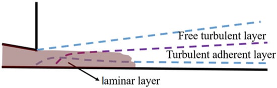 According to the transport principle, the flow of liquid metal from the inner gate into the cavity can be simplified by the model shown in Figure 12. The liquid metal thickness at the initial filling stage is consistent with the thickness of the inner gate. The metal flow can be divided into three areas in the direction of thickness: The bottom laminar flow area, whose flow is affected by the viscous force due to the influence of the boundary layer; in the middle is the adherent turbulence area, where the velocity of each flow area is the highest. The upper layer is the free turbulent layer because it has not been affected by the molded wall. The bottom layer and middle layer can be regarded as the turbulent boundary layer, and the upper layer is treated as the turbulent jet. Jet entrapment is due to the discontinuity of the velocity’s stability producing certain fluctuations and developing vortices that cause turbulence so that the static fluid around it will be sucked in. Because the bottom layer and the middle layer are close to the wall, the flow is restricted by the wall’s surface, and the surrounding medium cannot be sucked in, resulting in a large velocity gradient. The increase in kinetic energy and the effect of friction force decrease the static pressure; thus, the pressure difference between the upper and lower sides of the jet is formed, making the jet bend and stick to the wall surface, forming the wall-attached effect. The adhesion wall of liquid metal is difficult to fuse with the liquid metal, so it easily forms cavity defects.