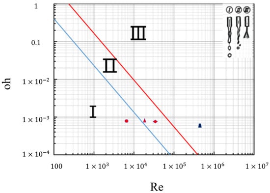 Types: σ, ρ, μ, u, and d represent the surface tension, density, viscosity, flow velocity, and characteristic diameter of the fluid, respectively. Re represents the specific gravity of the inertial force and viscous force, We represents the specific gravity of the inertial force and surface tension, and Oh represents the influence of viscous force on inertial force and surface tension. The relationship between the stability of liquid flow and Re and Oh was analyzed. The liquid flow was divided into three different types according to the value of Re and Oh: splashing, wavy collapse, and atomization (as shown in Figure 13).