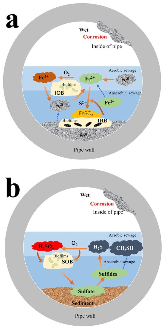 - Jiang, G.; Zhou, M.; Chiu, T.; Sun, X.; Keller, J.; Bond, P. Wastewater-enhanced microbial corrosion of concrete sewers. Environ. Sci. Technol. 2016, 50, 884–892. [Google Scholar] [CrossRef]