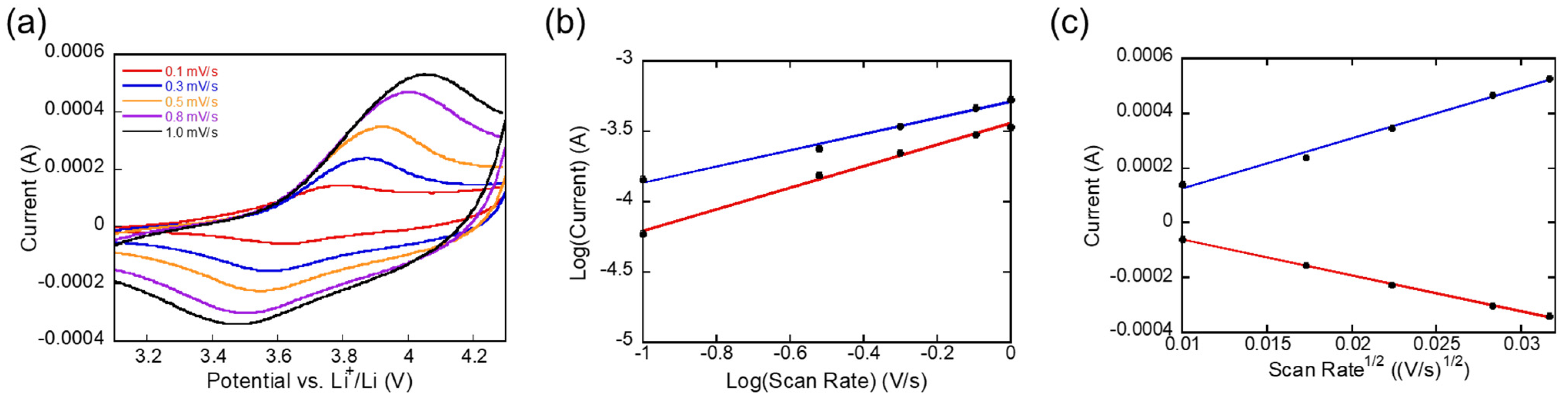 | b-Value | Diffusion Coefficient (cm2⋅s−1) | Fraction of Capacitive to Diffusive Charge Storage (1.0 mV/s) | Average Specific Capacity (mAh⋅g−1) (0.5 C) | Average Specific Capacity (mAh⋅g−1) (2 C) | Average Specific Capacity (mAh⋅g−1) (5 C) | ||
