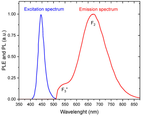 Photoluminescence excitation (PLE) and emission (PL) spectra for LiF crystal after exposure to Sr-90/Y-90 beta source. The emission spectrum was measured using a 505 nm long-pass filter to cut off the excitation light.