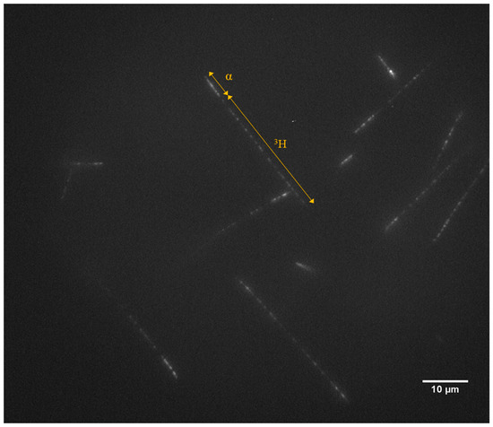 Detection of neutrons with LiF fluorescent nuclear track detectors has already been successfully attempted [9]. The products of the (n,α) reaction with 6Li nuclei create some characteristic in LiF, directed in opposite directions, tracks: brighter and shorter (6 µm) alpha particle and longer (33 µm) tritium nucleus (Figure 2). The LiF detectors were tested as personal dosimeters, i.e., irradiated with neutrons in a reference calibration laboratory on a phantom simulating the human body. In this way, they could measure neutrons reflected and moderated by the body (so-called albedo method [10]). The tests of such an approach revealed that using LiF detectors, it is possible to measure neutron doses at least as low as 1 mSv. However, due to the low density of tracks to achieve good statistics, a large area of a crystal needed to be scanned, which is a time-consuming process.