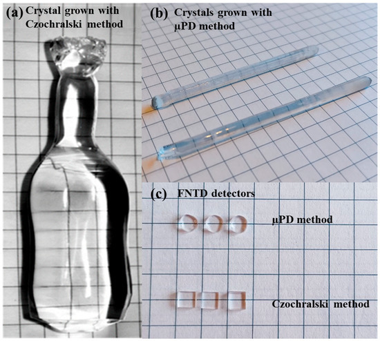 Examples of LiF crystals grown with (a) Czochralski method; (b) µPD method. Panel (c) shows a comparison between FNTD detectors cut from crystals produced with both methods.