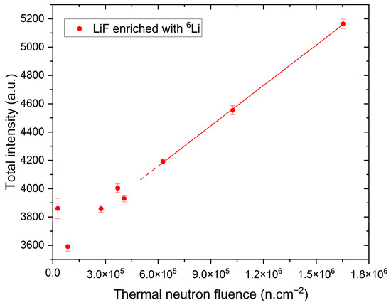 However, track counting is not the only analysis method available for images acquired with FNTDs. Besides that, it is also possible to measure and compare the total intensity of light in a field of view. We checked if this procedure can be used to estimate the dose of thermal neutrons with 6LiF FNTDs, especially in neutron fields stronger than 2.8 × 105 n.cm−2 (the highest fluence for which the track counting method could be applied without any corrections). Figure 6 shows the relationship between the total intensity in the field of view and the thermal neutron fluence. The linear relationship is present for the fluence values higher than about 5.0 × 105 n.cm−2. This indicates that it is indeed possible to use this approach for measurements of high neutron doses. In the case of lower doses and, therefore, a low number of tracks, the total intensity of the photoluminescence signal emitted from tracks cannot be distinguished from the fluctuations of the background noise, and, therefore, this approach is not applicable. In the transition region, i.e., for the fluence values ranging between c.a. 3.0 × 105 n.cm−2 and 5.0 × 105 n.cm−2, both methods are not linear, and appropriate correction factors should be established.