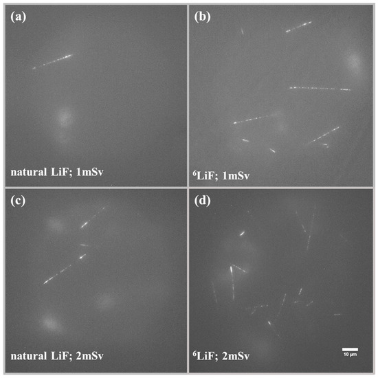 The previous work demonstrated that the number of visible tracks in LiF crystals increases proportionally with the fluence of thermal neutrons [9]. Figure 4 shows maximum intensity projections of images registered with the detectors made of natural LiF (Figure 4a,c) and LiF enriched with 6Li (Figure 4b,d). The tracks visible in the pictures result from a 6Li(n,α)3H nuclear reaction, as they have a characteristic shape: they consist of two parts, the brighter and shorter part coming from the alpha particle and the longer but less intense part coming from the tritium particle. It is clear that increasing the isotopic content of 6Li significantly increases the number of observed tracks and, therefore, decreases the lower detection limit of LiF FNTD detectors.