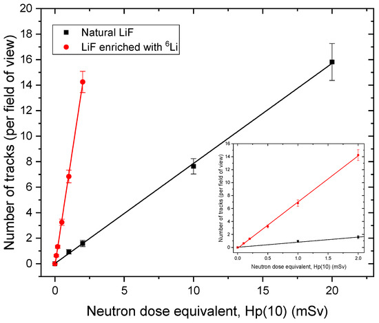 Number of tracks per field of view versus neutron dose equivalent Hp(10) for detectors made of natural and 6Li-enriched LiF. The inset graph shows in detail the results in the range up to 2 mSv.