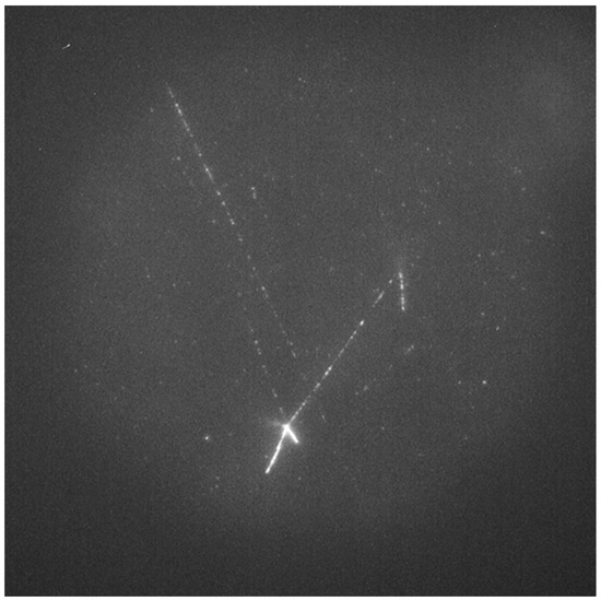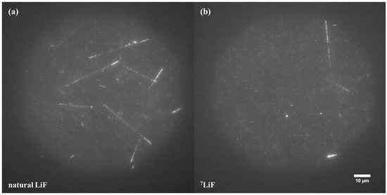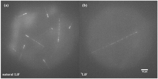 Similarly to the high-energy neutron fields, also in space radiation measurements, it may be beneficial to use 7Li-enriched LiF crystals to simplify image analysis by removing the high number of tracks resulting from reactions with low-energy neutrons. Figure 12 shows a comparison between the images obtained for natural and 7Li enhanced LiF crystals, which spent 6 months on the International Space Station in Earth orbit. In Figure 12a, which shows the image for natural LiF, tracks coming from 6Li(n,α)3H reactions are numerous and bright. For that reason, they may overlap and cover other tracks, mostly created by ions. For 7Li-enriched crystals (Figure 12b), analysis is easier, as ion-induced tracks are easier to distinguish in the absence of tracks resulting from low-energy neutrons. Figure 13 shows another example of cosmic radiation tracks: the image registered for a 7LiF crystal exposed on the lunar orbit in the frame of the MARE experiment. One can see tracks in the shape of several lines, some of them very bright, converging at one point. This pattern suggests a nuclear reaction (nucleus fragmentation) due to a collision with an ultra-high-energy particle of the cosmic radiation spectrum.