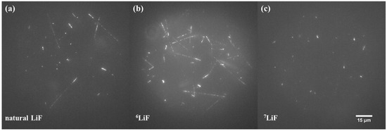 Comparison of images acquired after irradiation with fast neutrons from Pu-Be source for (a) natural LiF, (b) LiF enriched with 6Li, and (c) LiF enriched with 7Li. Maximum intensity projection of 21 images taken at depths ranging from 10 to 30 µm under the crystal surface.