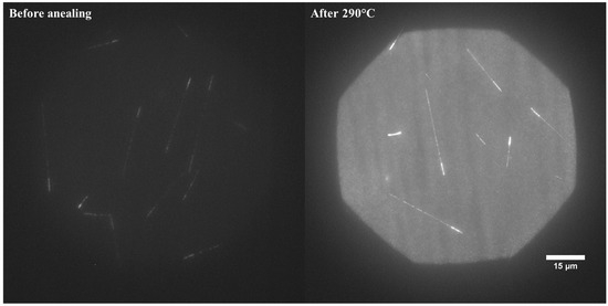 For all LiF crystals, regardless of their isotopic composition, annealing at 450 °C for 30 min leads to complete removal of the photoluminescence signal [20]. However, it was previously found that a heat treatment at a lower temperature may, in certain conditions, lead to signal enhancement [21]. The mechanism leading to this effect is still unclear. In our previous studies, we demonstrated that post-irradiation annealing at 290 °C for 3 min can cause a mean track intensity improvement by a factor of 2.5. This can be especially useful for neutron detection purposes, as the tritium tracks, which are a product of 6Li(n,α)3H reaction, have low intensity and may sometimes be hard to distinguish from the background. Figure 14 illustrates the impact of the amplification effect on tracks registered with LiF crystals after irradiations with thermal neutrons. Although the background also increases after post-irradiation annealing, the contrast between tracks and background is much better, which makes image analysis easier.