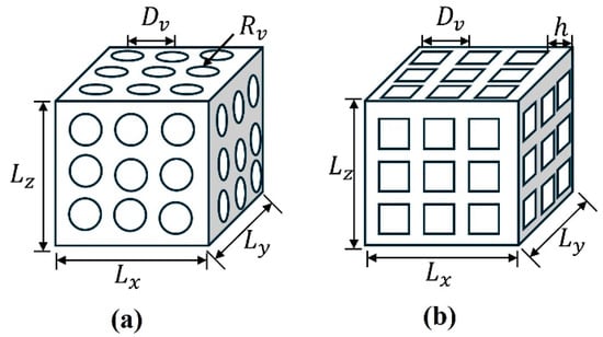 Based on the above matrix materials, this paper for different constant cross-section porous structures and variable cross-section porous structures is defined as shown in Figure 1. Figure 1a shows the reference specimen with the size of , which is a rectangular porous specimen with arrays of spherical holes where the distance between the holes is and the radius of the holes is . And Figure 1b shows the square hole model where the distance of holes is , and the length of the square is . The specimens and dimensions analyzed are shown in Table 3.