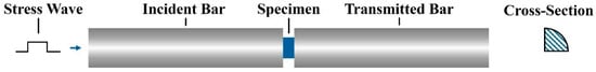 For dynamic mechanical analysis, the Hopkinson bar is usually used for experiments, and this method is one of the most important techniques for the study of dynamic properties of materials nowadays. Therefore, in this paper, based on the above experimental method, ABAQUS/explicit 6.14 is used to simulate and analyze the dynamic impact of the structure described in Section 2.1, and the simulation model assembly schematic is shown in Figure 2. In order to reduce the computational accuracy, a quarter model is used, and the model interface is defined as a symmetric cross-section. A Ti-6Al-4V bar with a diameter of 13 mm is selected for the incident and transmitted bar. According to the one-dimensional stress wave theory, in order to ensure that the used specimen is always in stress equilibrium during the testing process, the loading time should be much longer than the time required for the stress wave to travel back and forth within the specimen once. The length of the loading direction of the specimen is 2.5 mm, and the wave speed of the specimen is , so the loading time should be much longer than , and the loading time of 0.1 ms is used in this calculation.