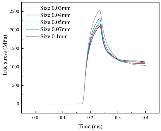 During the numerical simulation of impact processes, cells often fail due to deformation as a result of large loads. In the analysis using ABAQUS/explicit, the above Johnson–Cook failure model is used for mesh deletion. However, a mesh with too much distortion still occurs, which leads to errors in the calculation. Therefore, it is necessary to use smaller cells for meshing to improve the precision and accuracy of the calculation, but the actual calculation process is limited by the calculation time. It is impossible to divide the test piece into dense mesh, so it is necessary to verify the mesh irrelevance. Mesh sizes of 0.1 mm, 0.07 mm, 0.05 mm, 0.04 mm, and 0.03 mm, respectively, were dynamically loaded at a strain rate of . The average Mises stress at the transmissive end face of the specimen was used as a verification method, and the strain time curves obtained from the calculations for different mesh sizes are shown in Figure 3.