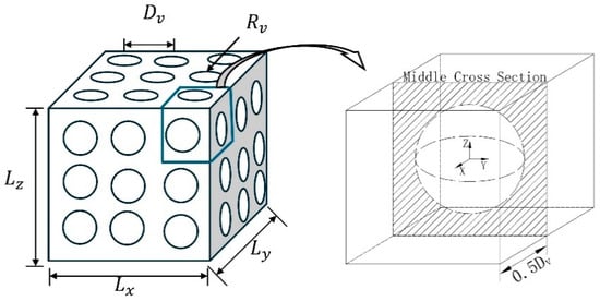where is the cross-sectional area and is the radius of the circle corresponding to the cross-section. According to Equation (6), the volume equation of the array spherical hole model can be obtained as follows: