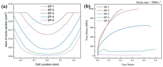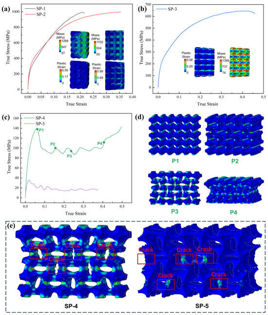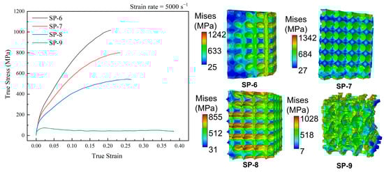 Figure 5b and Figure 6 show the stress–strain curves and cloud diagrams of the array hole models under impact with a strain rate of . Model SP-1 and model SP-2 correspond to closed cells, and model SP-3 to model SP-5 correspond to open-cell models. The stress–strain curves corresponding to SP-1 and SP-2 do not differ much, and the main deformation form of SP-1 is dominated by vertical compression through the stress–strain comparison in Figure 6a. In SP-2, the stresses are mainly distributed in the middle of each cell (i.e., at the smallest cross-sectional area in Figure 5a), i.e., the diameter part of the spherical hole. It can be predicted that the trend will be more pronounced as the radius of the spherical aperture increases. Figure 6b shows the stress–strain curve of the open-cell unit, whose stress concentration location is closer to the open-hole section, while the structure still exhibits compression-dominated deformation. It can be clearly seen in Figure 6c that the dynamic response form is different from the previous three structures in that after the structure reaches the yield point for the first time, the stress decreases rapidly, and a softening phenomenon occurs. However, a certain degree of rebound of the stress occurred again in the follow-up. Based on the stress–strain curves, the points (P1–P4) taken for the SP-4 structure were observed. In the vicinity of its first yield point, the plastic strain cloud at point P1 (Figure 6d) shows an approximately uniform deformation, concentrated in the center of the cell, but two larger strains appear at the second layer of the cell. With further sub-propagation of the stress wave, the specimen produces bending deformation along the larger strains, which deforms and twists the circular unit hole into an ellipse (P2), at which point, the specimen enters a relatively stable state again and the stress rises back. With further increases in strain, each layer of cells produced large torsional deformation, and eventually, the whole experiment was compressed into a dense structure. Therefore, in the last part of the loading, the stresses applied to the structure are further elevated, forming a rising section after the P4 point. Like the SP-4 structure, the SP-5 structure also has such a phenomenon, which in turn, produces the upward and downward fluctuation of the stress–strain curve. Since the fluctuation is small, when used as an energy-absorbing structural member, the outer part will remain in a relatively stable stress state during the loading of this part. This phenomenon proves to be beneficial as a stable energy-absorbing structure, i.e., quasi-static stiffness structure.