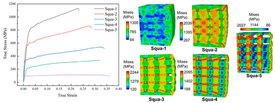 As analyzed in Section 3.1, for the variable section hole model subjected to impact loading, the stresses are concentrated in the part with the smallest cross-sectional area. The size of the cross-sectional area will affect the deformation form of the structure and cause the structure to fail. If the structural holes are set as regular squares, the calculated stress–strain curves and cloud diagrams are shown in Figure 8. Unlike the array spherical models, the deformation form of the rectangular hole model is always compression-dominated. It can be equally observed via Squa-1 and Squa-2 in Figure 8 that the profit is distributed mainly at the edges of the structure. As the hole in the structure increases, the layered bending at the edges becomes apparent, eventually resulting in a bending deformation as shown in Squa-5. Unlike the array spherical model, the overall structure does not show instability and fracture. However, quasi-zero stiffness deformation also occurs.