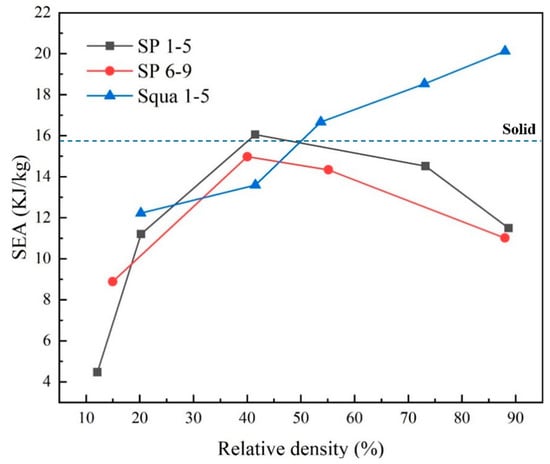 In the spherical hole models, the SEA value first rises and then decreases with the increase in porosity, reaching an extreme value at a relative density of 40%. Through Section 3.1, at , the structure shows compression-dominated deformation; at , the structure tends to bend-dominated deformation. And its SEA reached its maximum value when shifting from a closed-cell to an open-cell structure.